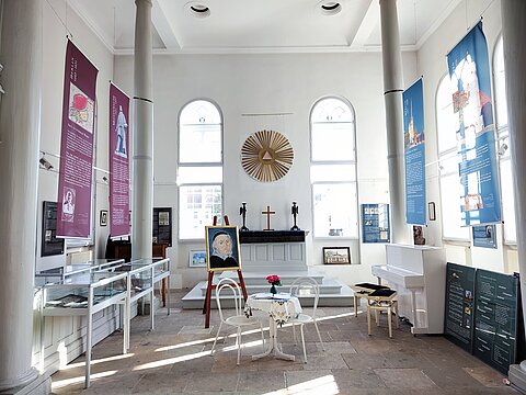 Gräfenhainichen ehrte Paul Gerhardt mit der klassizistischen Paul-Gerhardt-Kapelle, die in den Jahren 1830-1844 mit Spenden aus der Bevölkerung gebaut wurde. König Friedrich Wilhelm IV. stiftete zur Ausstattung der Kapelle ein lebensgroßes Bild Paul Gerhardts, einen Teppich, eine Altardecke und Altarleuchter. Die Leuchter und Altardecke können Sie in unserer Dauerausstellung bewundern. Das Bild befindet sich heute im Paul-Gerhardt-Gemeindehaus. Eine Besonderheit der Kapelle sind die auf allen vier Seiten hochgezogenen Sprossenfenster. Den Innenraum kennzeichnen, jeweils rechts und links angeordnet, vier schlanke Säulen. Die Gedächtnisstätte beherbergt heute neben einer umfangreichen Dauerausstellung über Leben und Wirken Paul Gerhardts eine Paul-Gerhardt-Bibliothek. Ein besonderer Blickfang der Ausstellung ist das große Paul-Gerhardt-Porträt des weißrussischen Malers Wassili Jeremejew. Das stilvolle Ambiente der Kapelle bietet auch wechselnden Ausstellungen auf der Empore und verschiedenen kulturellen Veranstaltungen ein besonderes Flair.